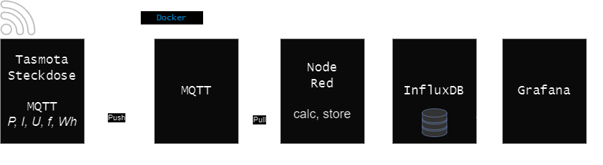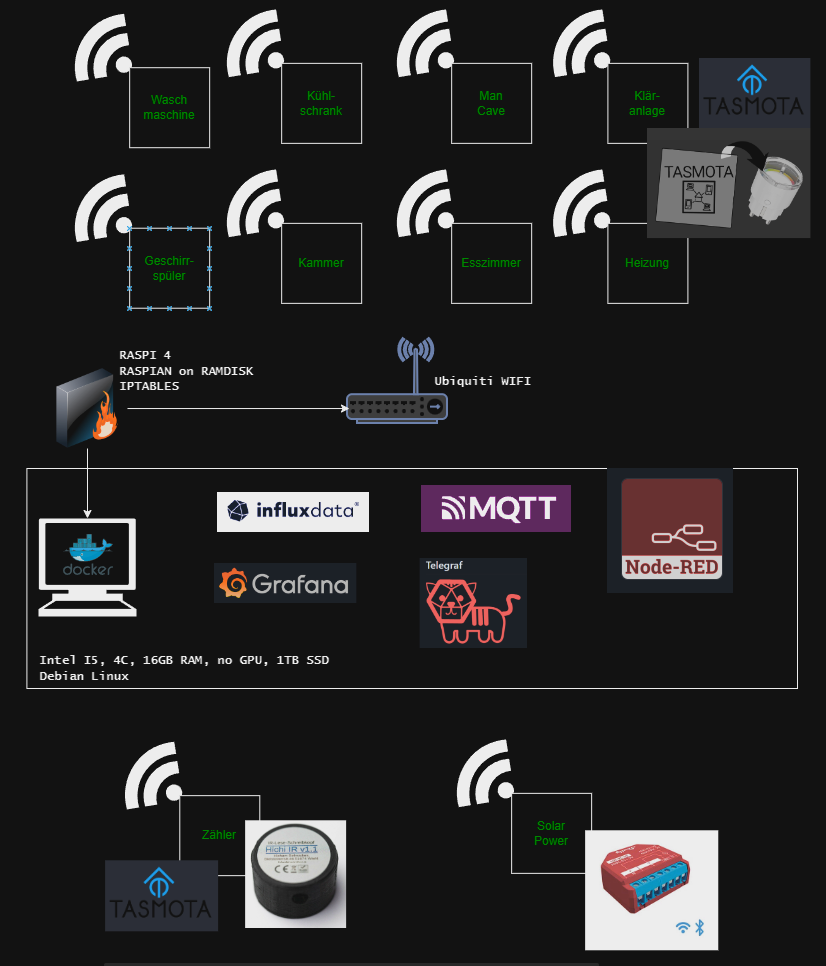 Die meisten Messpunkte sind Nous-Steckdosen die mit Tasmota geflasht sind. Tasmota ist ein Open Source System für alle smarten Geräte, die mit einem ESP8266 Chip ausgestattet sind. Die Dosen gibt es schon fertig geflasht oder man kann auch selbst Hand anlegen. Tasmota unterstützt eine Reihe von Protokollen, für mich das wichtigste: MQTT